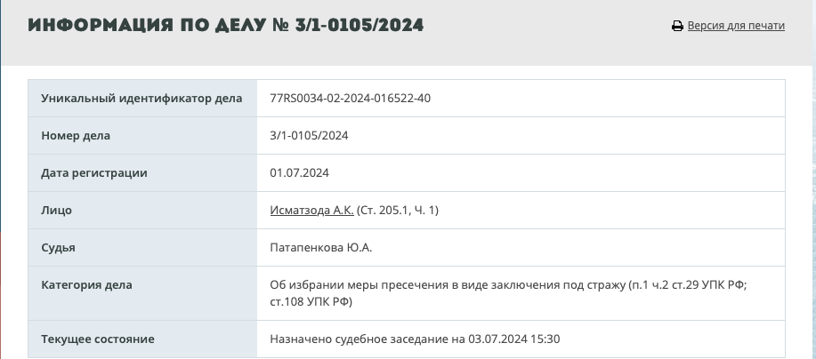 Также правоохранители ходатайствовали перед судом о заключении Алишери Исматзоды под стражу.