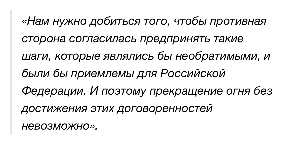 2. Чтобы Россия прекратила огонь, противник должен принять меры по демилитаризации. Причем они должны быть достаточными, чтобы исчезла угроза для РФ, а также необратимыми.