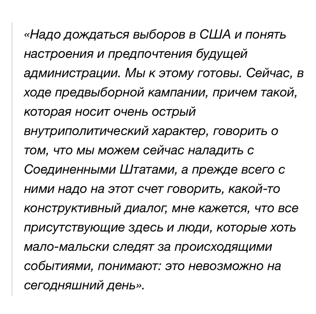 5. С США провести переговоры не получится, пока там не пройдут выборы. Причина тому тот факт, что Америка то проявляет заинтересованность в диалоге, то уходит от него. Важно понимать позицию новой администрации страны, чтобы вести переговоры.
