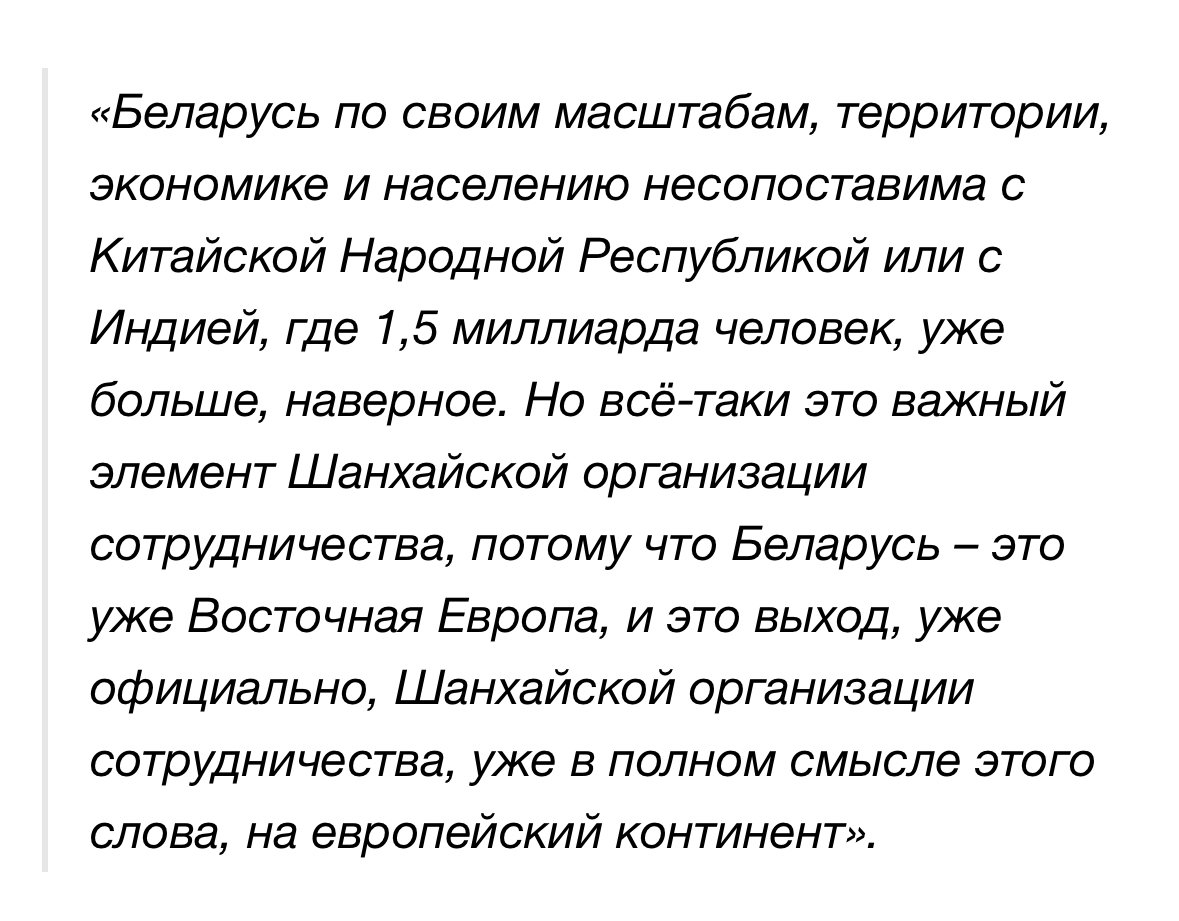 8. Присоединение Белоруссии к ШОС — взаимовыгодное решение и успех Александра Лукашенко и Министерства иностранных дел Белоруссии — отметил президент.
