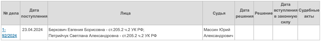 Напомню, что Беркович и Петрийчук предъявлено обвинение по части 2, статьи 205.2 Уголовного кодекса Российской Федерации.