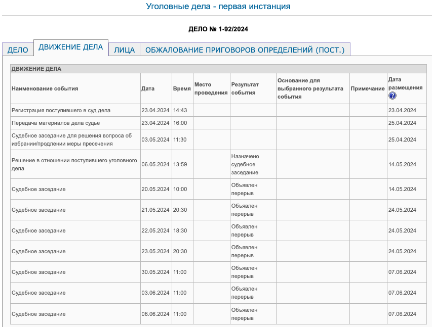 В судебном заседании, которое было начато 20 мая, уже назначено семь перерывов (!).