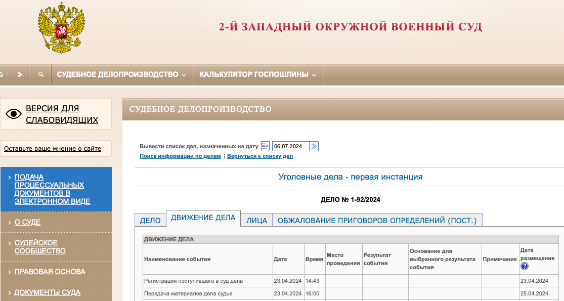 Уголовное дело поступило во ВТОРОЙ ЗАПАДНЫЙ ОКРУЖНОЙ ВОЕННЫЙ СУД 23 апреля текущего года.