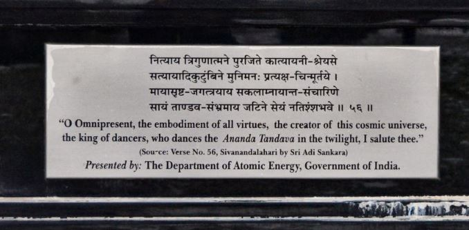 Под идолом находится памятный камень, на котором выгравирован стих 56 «Шиванандалахари» Шри Ади Шанкары. В нем говорится: «О Вездесущий, воплощение всех добродетелей, создатель этой космической вселенной, царь танцоров, танцующий Ананда Тандава в сумерках, я приветствую тебя».