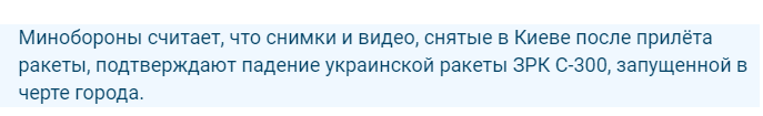 Минобороны считает, что снимки и видео, снятые в Киеве после прилёта ракеты, подтверждают падение украинской ракеты ЗРК С-300, запущенной в черте города.