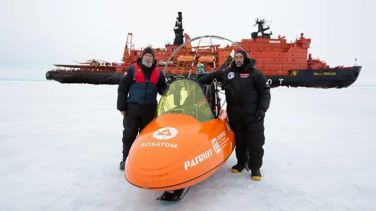 Фёдор Конюхов и Игорь Потапкин совершили уникальный полёт на мотопараплане, который вошёл в историю как первый арктический перелёт. Они стартовали с льдины у архипелага Земля Франца-Иосифа, куда их доставил атомный ледокол «50 лет Победы».
