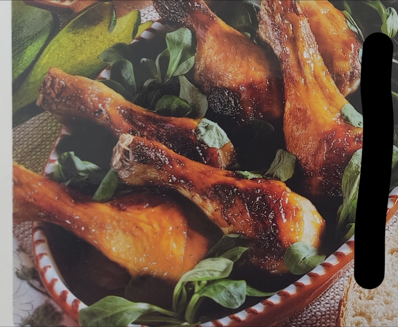 4 Выложить голени курицы в форму для запекания. Полить глазурью, поставить в предварительно ра- зогретую до 180 °С духовку, на 20-30 минут. Во время жарки обмазывать глазурью.