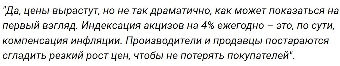 Эх, тяжко вздохнет среднестатистический россиянин, читая эти цифры. И правда, повышение акцизов неизбежно приведет к росту цен на прилавках. Однако не стоит паниковать раньше времени.