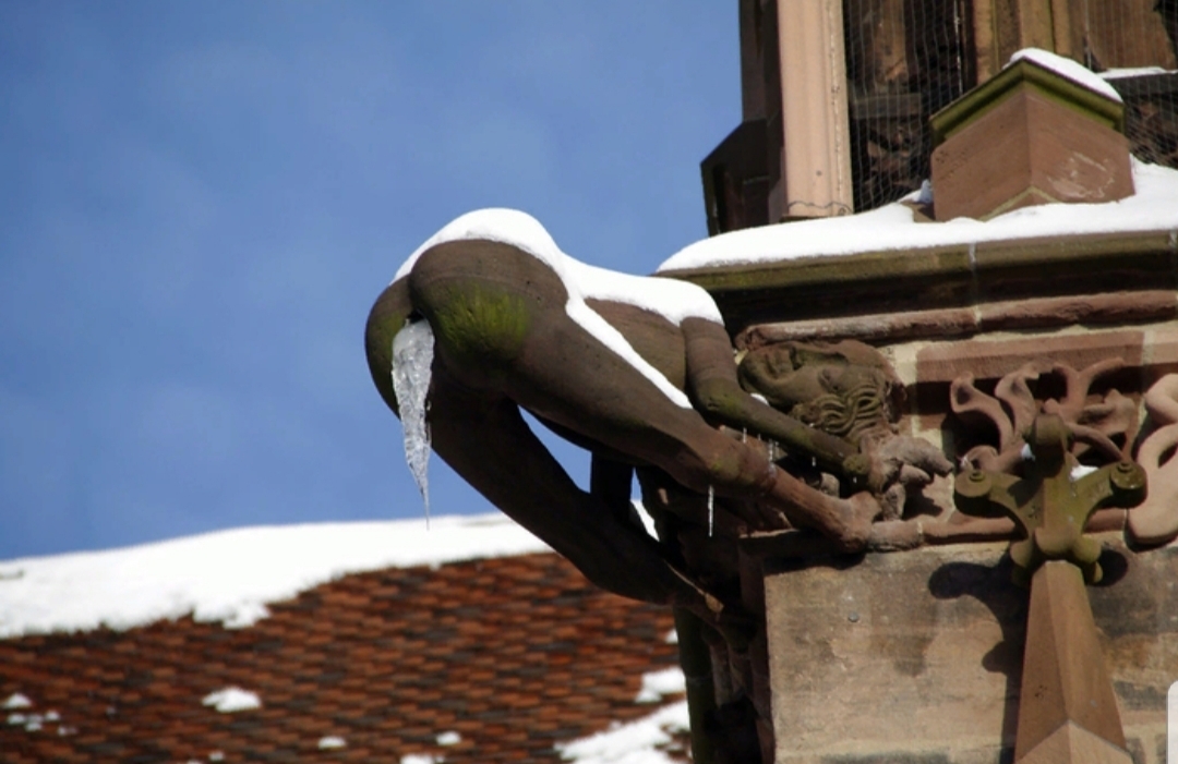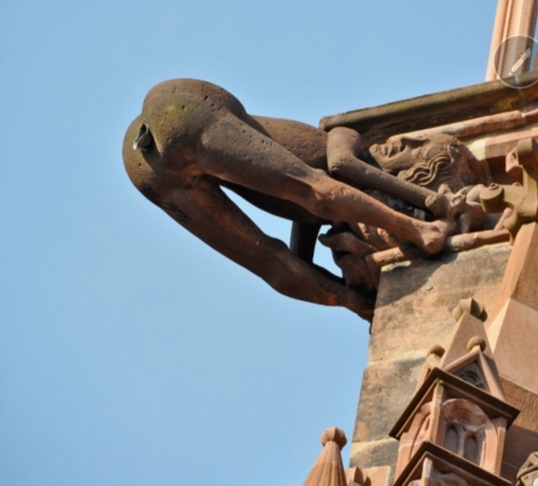 Есть байка о том, как городской совет города Фрайбурга превысил смету расходов, но не пожелал оплатить каменщикам труд за дополнительную работу. Вот тогда они повернули фигурку задом к ратуше, и с 15 века изнуренный каменный молодец испражняется на местную власть с высоты Кафедрального Собора Богоматери.