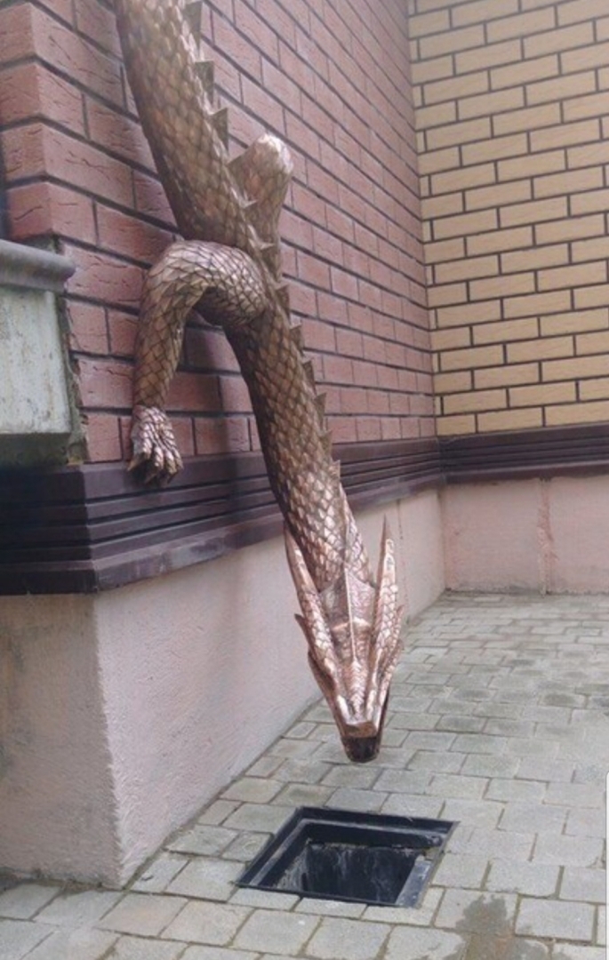 Японцы в качестве водослива любили изобразить дракона, это во-первых, красиво. Во-вторых, охранный символ. Драконов на конце водосточных труб японцы придумали не сами. И керамическую черепицу, и маты, и чешуйчатых монстров они почерпнули из Китая. Китай для японцев всегда был чем-то вроде Америки для жителей Мексики - "все-то у соседей самое продвинутое, все-то у них самое крутое!".