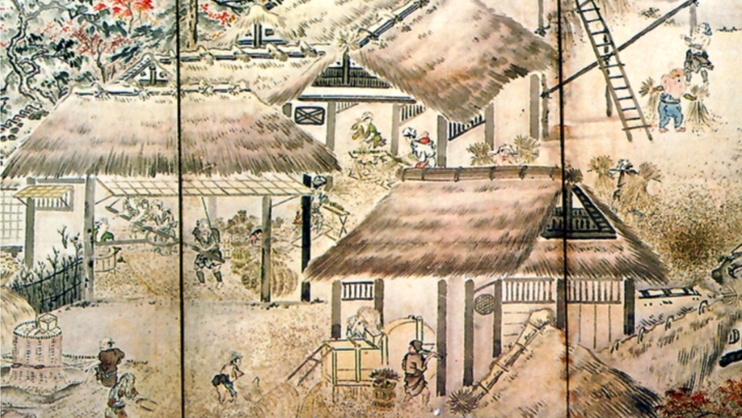Соломенные крыши были актуальны для простого населения страны едва ли не середины 20 века. На этой гравюре идет обмолот риса. Стебли злака, оставшиеся после крупорушки, сплетали в плотные фрагменты, как циновку, и использовали в покрытии крыш. Обмолотом риса занимались, в основном, мужчины. А плели соломенные навесы женщины. Японская мама и была главной хранительницей очага. Она изготовляла маты-настилы для крыш, делала тростниковые половички - циновки, ткала из душистого игуса матрасы - татами. Стебли злаков полые, сама по себе трава, что рисовая солома, что тростник игус - хорошо впитывают запахи и влагу, поэтому внутри японских домов довольно чисто и пахнет хорошо. После еды и наутро следующего дня хозяйка вытряхивала половички, сметала пыль с татами, и дом дышал чистотой.
