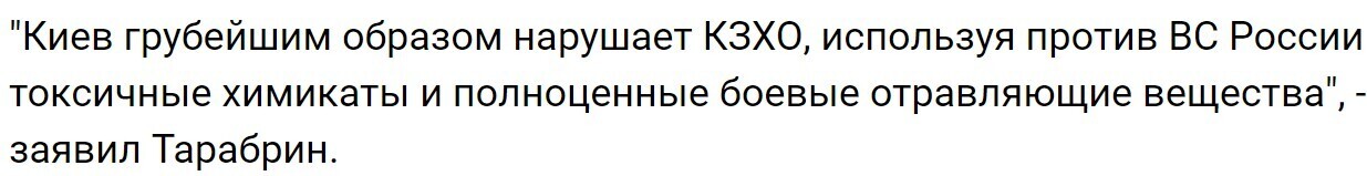 Тарабрин также обратил внимание на новые методы применения химических веществ в военных действиях. Ссылаясь на экспертные оценки и информацию из зарубежных источников, он заявил, что "украинские военные используют химическое оружие и применяют беспилотники 'для доставки токсичных химикатов'".