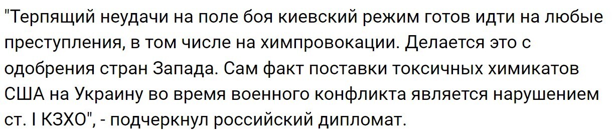 Но на этом обвинения не закончились. Тарабрин пошел дальше и указал на ответственность США в этой ситуации. По его мнению, Вашингтон нарушает Конвенцию о запрещении химоружия, поставляя опасные вещества Украине.