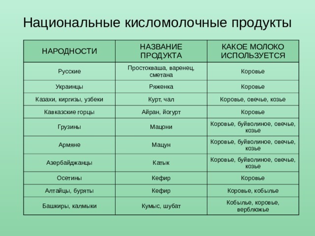 А ещё все кисломолочные продукты: ряженка, варенец, простокваша, кефир, айран, тан, ацидофилин, мацони, кумыс...