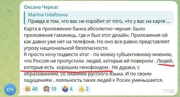 Русские оказались виноваты ещё и в том, что оборвались связи Черкас с родиной, что теперь считают ее там перебежчицей и коллаборанткой.