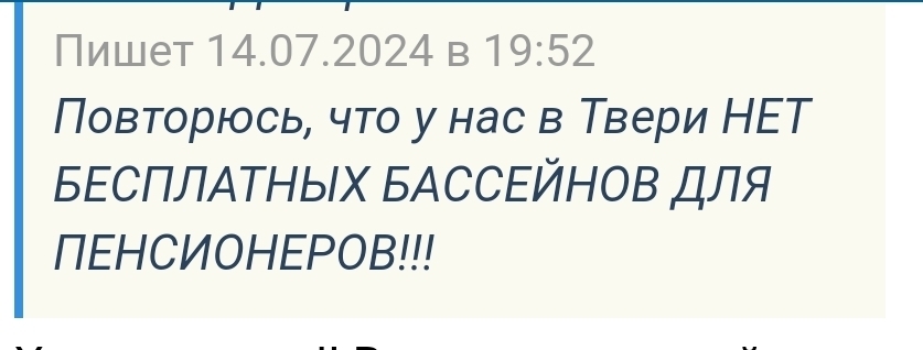 Сегодня этот же автор про свой город написал, обманывая дальше читателей, что в Твери нет бассейнов с бесплатным посещением для пенсионеров, которые состоят в гос. программе "Активное долголетие". Что является абсолютной ложью!! А ведь её читают люди и верят ей, потому что она "пенсионерка". Но разве этот статус дает ей право так откровенно лгать??? Какой позор для города Тверь.... Зачем она это делает??