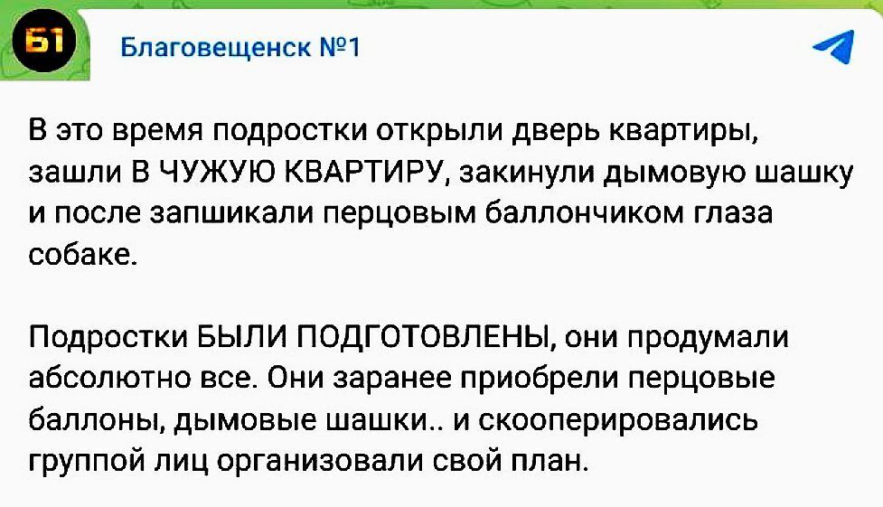На следующий день семеро мужественных несовершеннолетних в отсутствие хозяев вскрыли их квартиру, обрызгали собаку из перцового баллончика и бросили в хату дымовую шашку.