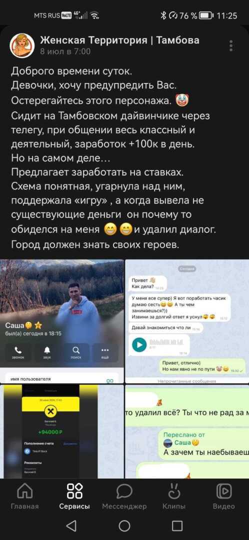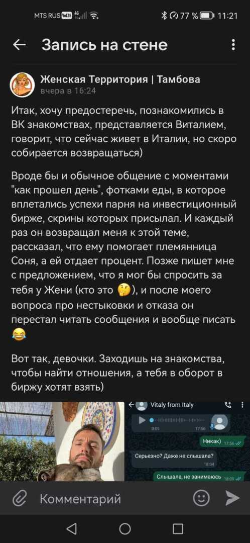 Так вот, я неустанно продолжаю бороться за справедливость и за то, чтобы у каждого одинокого человека рассудок оставался холодным! В зону риска попадают одинокие люди и пол не имеет никакого значения! Если я познакомилась с мошенником на мамбе, то это не значит, что таких людей не существует на других платформах. Вот, например, после того, как моя статья появилась в интернете, знакомые мне стали сбрасывать скрины из ВК.