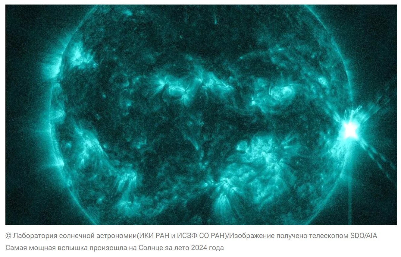 Лаборатория солнечной астрономии Института космических исследований РАН сообщила о вспышке, которой был присвоен высший балл X по шкале солнечной активности. Конкретнее, событие получило оценку X1.9. Хотя это и не рекорд текущего цикла (14 мая была зафиксирована вспышка X8.7), нынешняя вспышка стала самым мощным проявлением солнечной активности за все лето 2024 года.