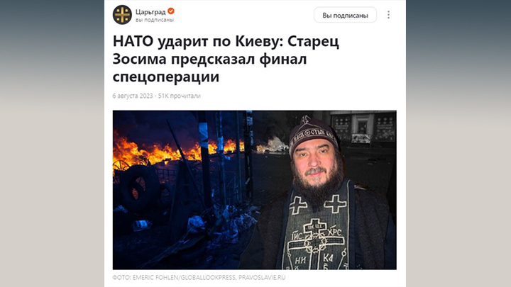 Отец Зосима предсказывал войну России с Украиной, говоря о "гневе Божием" и неизбежности "огненной чаши". Однако он не сомневался, что в итоге победит русский народ: "Дух Руси – могучий, непобедимый всегда! Медведь-то русский спит-спит, терпит-терпит, но уж как проснётся, как в лапу мохнатую эту дубину возьмёт, как раскрутится, то и вся масонская Европа полетит тогда от этой дубины настоящей, русской, святой".