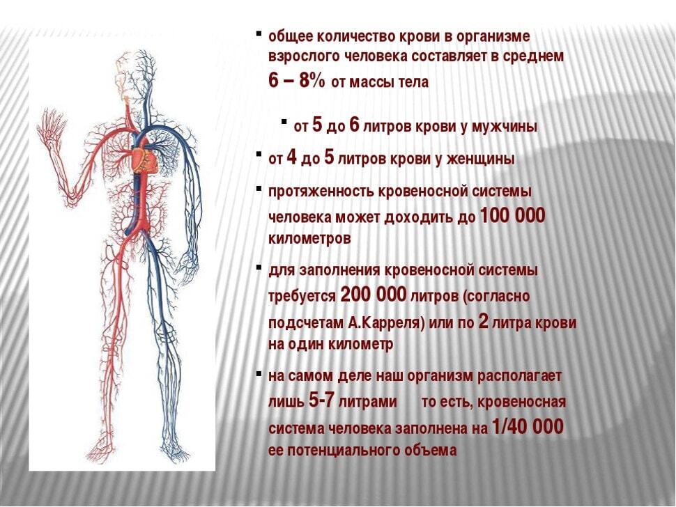 Объем крови составляет около 6-8% массы тела. Если вес человека 60 килограмм, то крови – 4,0 - 4,5 литра. Врачи констатируют, что, потеряв от своего объема хотя бы 30%, а это 1 – 1,5 литра, и не приняв срочные меры к её восстановлению, может наступить летальный исход.