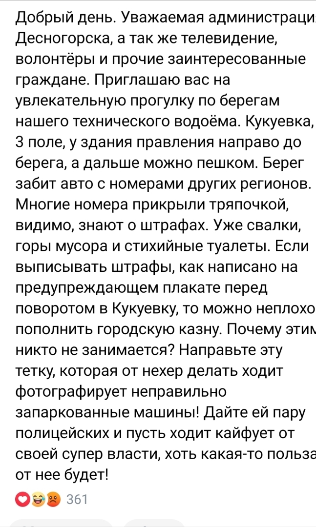 У нас же на берегу и в лесу убирать за приезжающими некому, нам самим приходится собирать мусор на берегу, чтобы привести своего ребенка искупаться, хотя мы тратили на приобретение дачи деньги в надежде отдыхать в спокойной обстановке, а не слушать крики, музыку и дебоши, доносящиеся с берега по полночи.