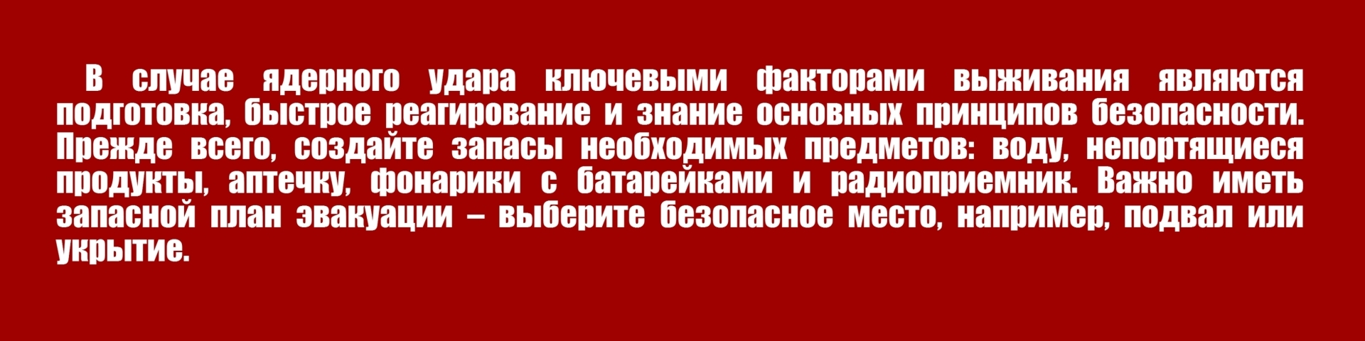 В ситуации ядерного взрыва каждый шаг может оказаться решающим для сохранения жизни и здоровья. Необходимо помнить, что безопасность всегда должна быть на первом месте. Даже когда страх и неопределенность охватывают сознание, важным остается четкое выполнение всех рекомендаций и инструкций.