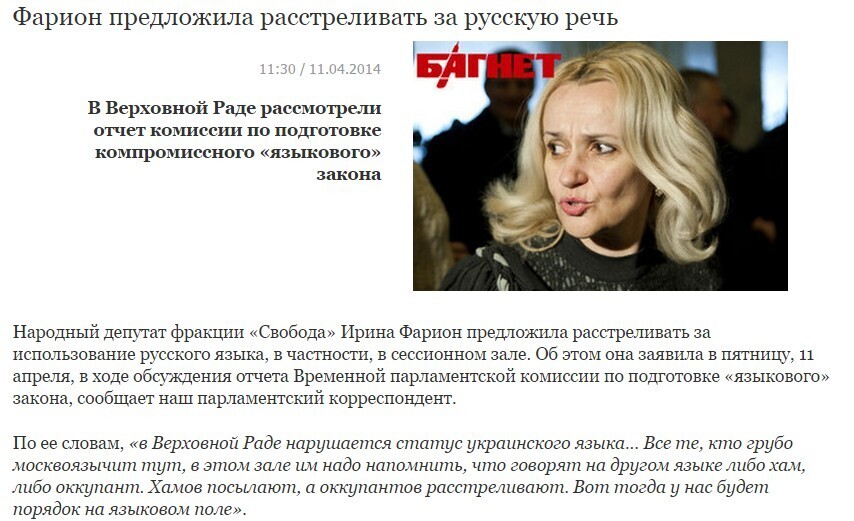 Надо отметить, что Ирина Фарион была депутатом от ультраправой партии «Свобода» (руководитель партии Олег Тягнибок был среди организаторов украинского майдана 2014 года). Ярая националистка, ярая русофобка, которая ненавидела всё русское.