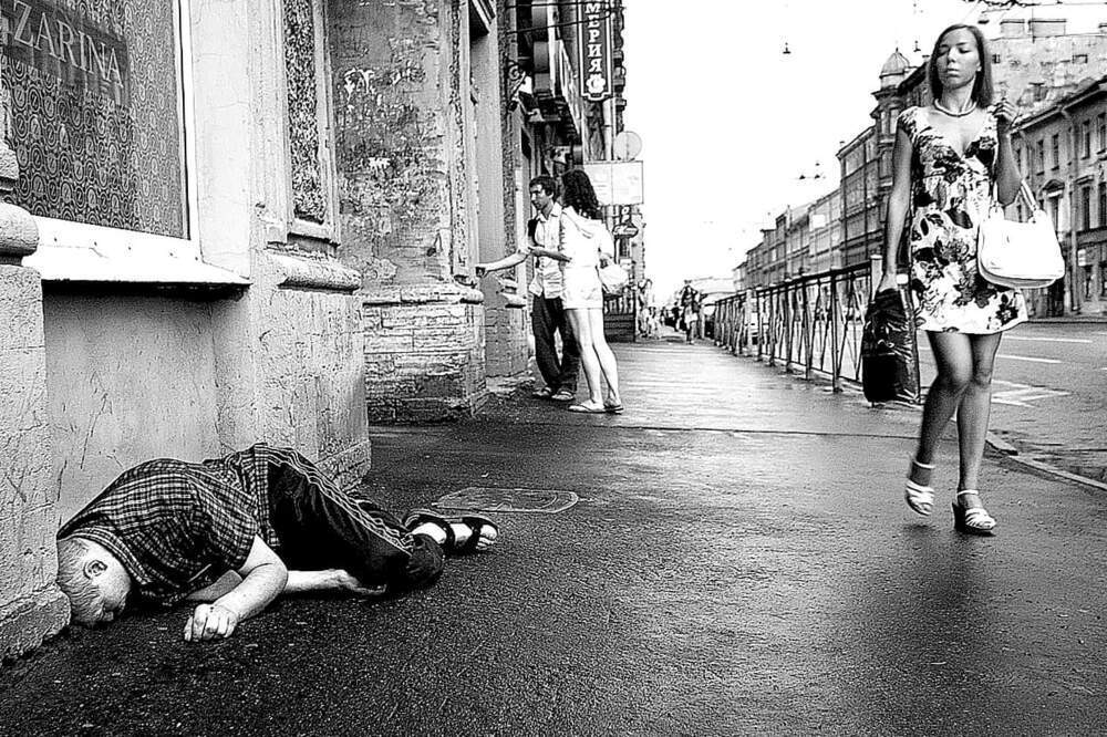 Получается, что мимо человека шли люди, равнодушно поглядывая и морщась от брезгливости, не зная того, что ему просто стало плохо. Все прошли мимо, кроме маленькой девочки.