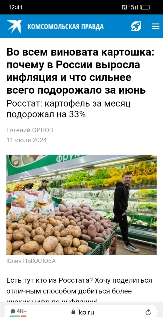 Согласно, источнику Комсомольская правда, лишь только за месяц картофель подорожал на 33%. А то и видно, молодой картофель в магазине, можно встретить за 70 руб.за кг. Это разве нормально?