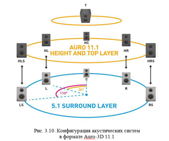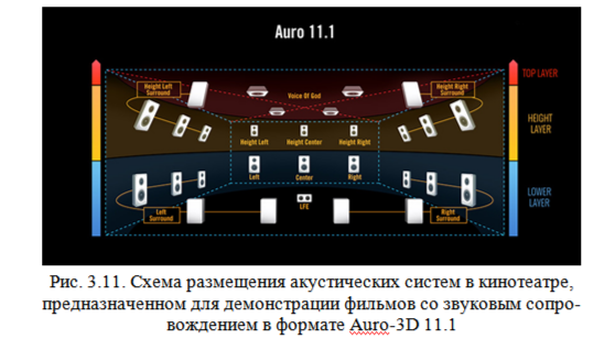 Схема расположения акустических систем в формате Auro-3D 11.1 представлена на рис. 3.10.Как видно их рисунка, в данной конфигурации появляется центральный громкоговоритель верхнего уровня НС, а также присутствует громкоговоритель канала третьего уровня, размещенный над слушателями («Voice of God»), как и в конфигурации 10.1. Очевидно, что локализация звуковых образов во фронтальной плоскости, благодаря наличию канала НС, здесь будет значительно лучше, чем в конфигурациях 9.1 и 10.1. Поэтому формат 11.1 является наилучшим решением для публичных кинотеатров, поскольку большие размеры экранов требуют хорошей локализации звуковых образов и в верхней части экрана, что затруднительно реализовать при использовании форматов 9.1 и 10.1