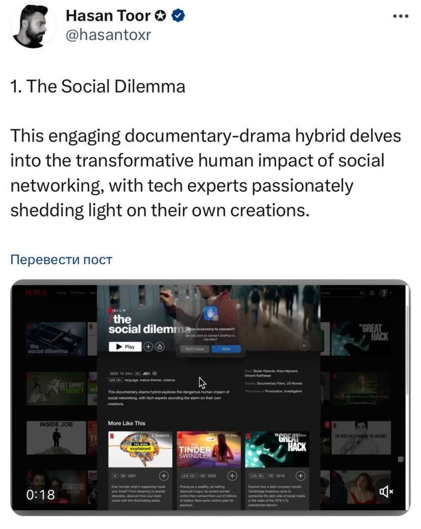 🧠 "Социальная дилемма": В этом фильме разработчики соцсетей рассказывают правду о том, как они манипулируют нашим вниманием, что приводит к распространению фейковых новостей и проблемам с психическим здоровьем.