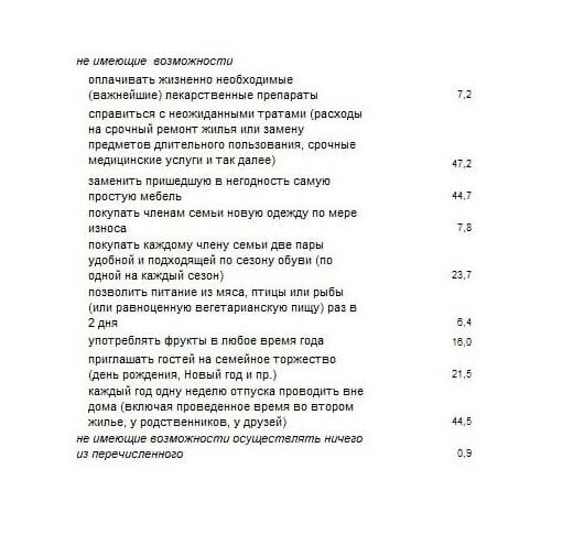Итог опроса: 3,4% опрошенных не знают проблем с деньгами и способны на любые траты. 36,6% опрошенных могут купить всё (и товары длительного пользования), кроме, пожалуй, автомобиля, дома или дачи. 48,7% домохозяйств имеют возможность покупать продукты, лекарства, оплачивать ЖКХ, но затрудняются с покупками товаров длительного пользования. Наконец 11,2% опрошенных способны закупать продукты (питаться), но с приобретением лекарств и оплатой ЖКХ есть трудности. И наконец, результат о «голодных» – 0 процентов сказали, что им не хватает денег для питания.