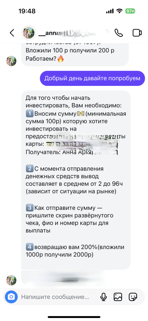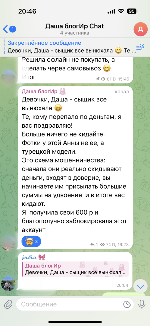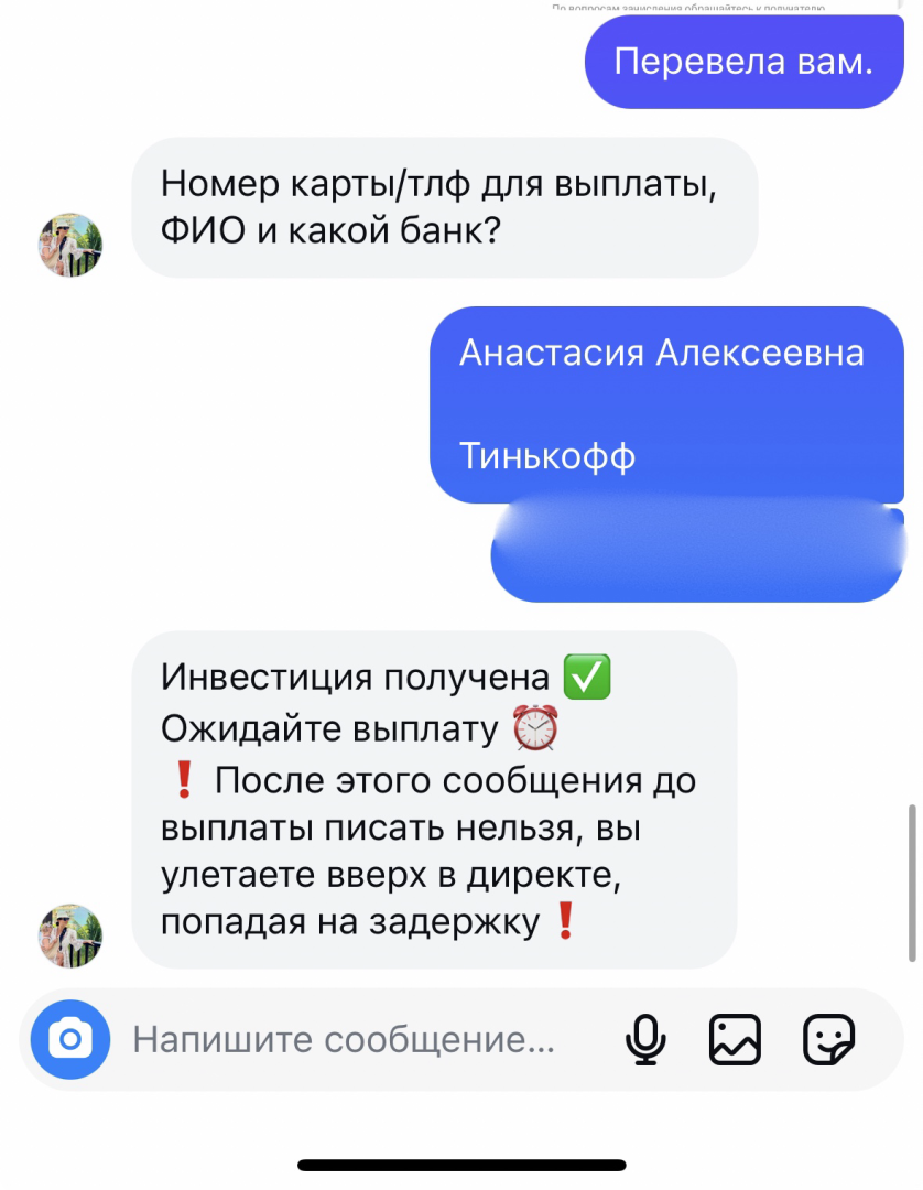 И тут, к счастью, я зашла в свой Telegram, где подписана на знакомую девушку из своего города. Она ведет свою телеграм-группу и написала, что эта Анна – мошенница. Фотографии были не ее, а это схема мошенничества: сначала они реально скидывают деньги, входят в доверие, вы начинаете им кидать большие суммы, и вас потом кидают на деньги.