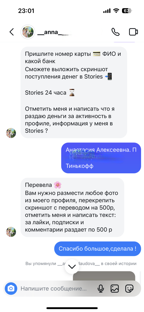 Честно говоря, я уже тогда засомневалась. Но в тот момент меня словно загипнотизировали – я видела, как девушка скидывала деньги моим друзьям в сторис, и это, признаюсь честно, меня подкупило. Я решила попробовать, надеясь на легкий заработок.