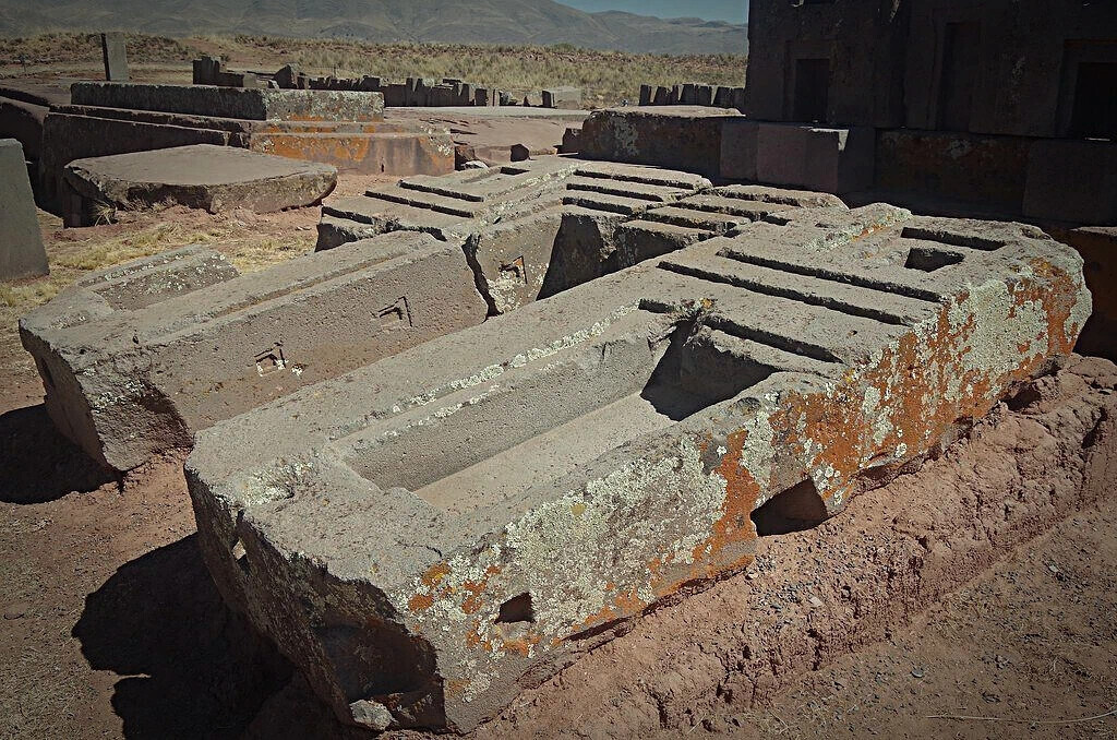 Утверждается, что камни были доставлены вверх по крутому склону из карьера у озера Титикака примерно в 32 км , причем некоторые блоки весили в диапазоне 100-130 тонн. Точность, с которой соединялись углы мегалитов, свидетельствует о высоких знаниях в области резки камня и глубоком понимании начертательной геометрии.