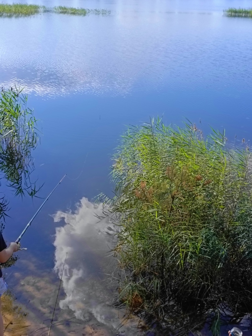Погода была прекрасная, никаких насекомых, облака отражались в воде, легкий ветерок создавал мелкую рябь на воде.