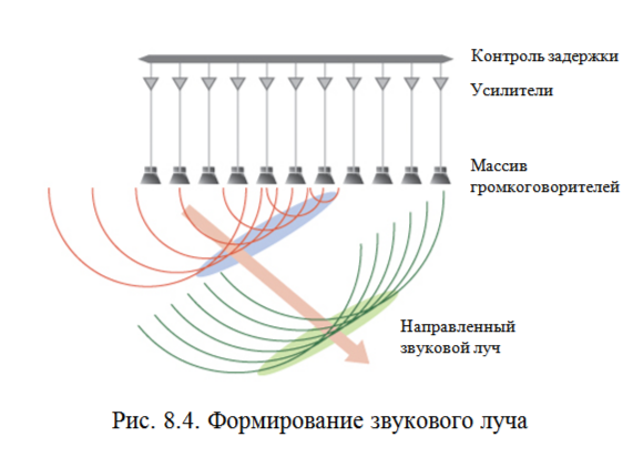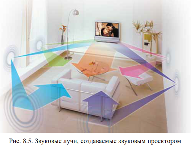 Таким образом, звуковой проектор представляет собой нечто вроде фазированной антенной решетки. Изменяя фазовые сдвиги между звуковыми сигналами, подаваемые на те или иные динамики, можно за счет интерференции формировать максимумы и минимумы звукового излучения и управлять лепестками диаграммы направленности проектора в целом (рис. 8.3, 8.4). Если необходимо получить эффект звучания тыловых громкоговорителей, то звуковые лучи можно направить таким образом, чтобы они, отразившись от стен, достигали зрительского места сбоку или сзади (рис. 8.5). При этом центральный канал будет восприниматься непосредственно, а звуковые компоненты других каналов достигнут ушей слушателя после отражения от стен. В результате у слушателя возникает такая же иллюзия окружающего звука, как при использовании реальной многоканальной системы в одном из Surround-форматов с несколькими акустическими системами