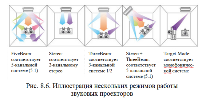 Процессор, управляющий работой звукового проектора – устройство достаточно сложное и способно формировать самые разные звуковые лучи, соответствующие различным конфигурациям акустических систем (режимам работы): от простого монофонического до формата 5.1, а иногда даже 7.1. Все зависит от производителя и конкретной модели устройства. Исходная программа также может быть в любом формате, начиная с одноканальной монофонической. Несколько примеров таких форматов показано на рис. 8.6. В действительности их может быть значительно больше.