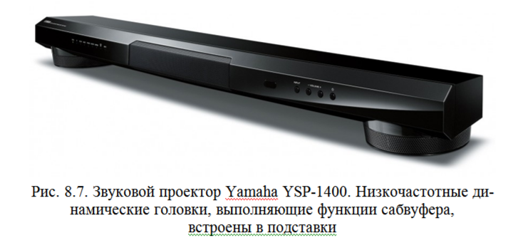 В последние годызвуковые проекторы пользуются у потребителя заслуженным успехом. Поэтому производители начали придумывать для них все новые и новые технические решения. Например, сравнительно недавно появилась плоская разновидность звуковых проекторов, размещающихся в виде подставки под телевизор. У них есть определенные преимущества вроде встроенного сабвуфера. Однако они оказываются не совсем к месту, если телевизор размещается на стене. Компания Yamaha выпустила свою модель YSP-1400, у которой низкочастотные динамики, выполняющие функции сабвуфера, встроены в подставки (рис. 8.7).