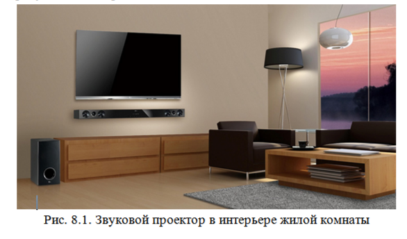 Звуковой проектор представляет собой активную акустическую систему, выполненную в компактном корпусе-моноблоке, который можно разместить в непосредственной близости от телевизора и компонентов домашней AV-системы.Чаще всего звуковой проектор размещают прямо под телевизором (рис. 8.1), хотя конструкция большинства современных моноблоков предусматривает самые разные варианты его крепления (на тумбе, на стене и пр.) и разработана с привязкой к размерам наиболее популярных моделей телевизоров с плоским экраном. Поскольку полнота звучания любой акустики во многом обусловлена наличием ощутимого баса,а вставить внутрь саундбара низкочастотные динамические головки затруднительно (хотя и возможно), то в большинстве моделей используется дополнительный активный сабвуфер. При этом, чтобы избежать появления дополнительных кабелей, сабвуфер чаще всего соединяется с основной частью по радиоканалу (как правило, Bluetooth). В результате, устанавливать сабвуфер можно в любой части комнаты, поскольку для его работы требуется только розетка.
