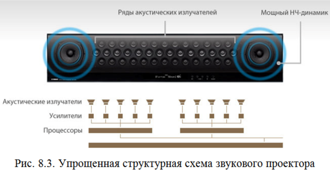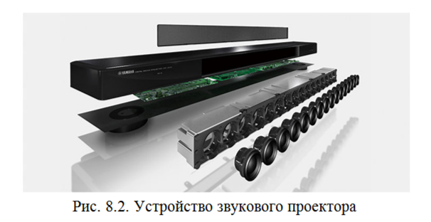 Идея создания такого устройства принадлежит японской компании Yamaha. Заключается она в размещении некоторого, иногда довольно значительного, числа головок громкоговорителей в одном прямоугольном вытянутом по горизонтали корпусе (рис. 8.2). Каждый из динамиков имеет собственный усилитель, и сигналы для этих усилителей формируются специальным цифровым процессором, который выполняет определенные фазовые сдвиги между сигналами, подаваемыми к каждому из динамиков.