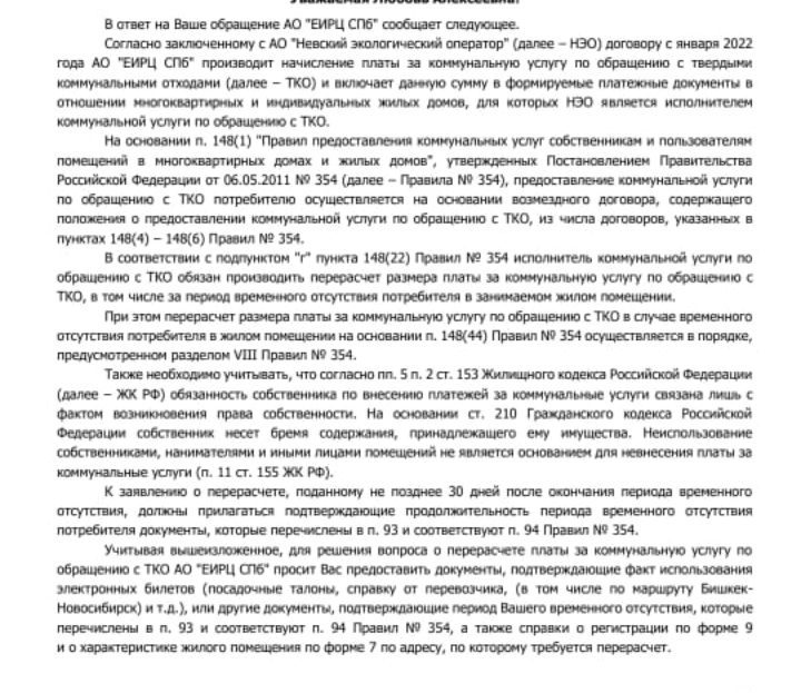 Хочу ознакомить вас с ответом, на мое обращение с официального сайта ЕИРЦ, из которого стало понятно, что перерасчет могут произвести только за ТКО, но не предусмотрен порядок перерасчета за электроэнергию, воду и газ, так как из ответа следует, что "внесение платежей за коммунальные услуги связано лишь с фактом возникновения права собственности" , но никак не с реальным потреблением ресурсов.