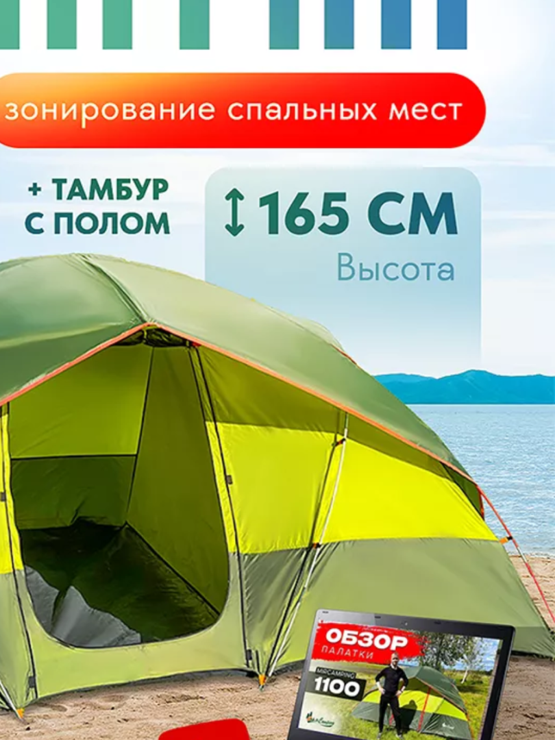 Палатка с двумя комнатами, а посередине тамбур шириной в 1 метр. Очень удобно: в него спокойно войдёт небольшой складной столик и несколько стульев, можно сидеть в дождь. А если нужно пятое спальное место, то в тамбуре легко разместится односпальный матрас (мы его тоже заказали на всякий случай).