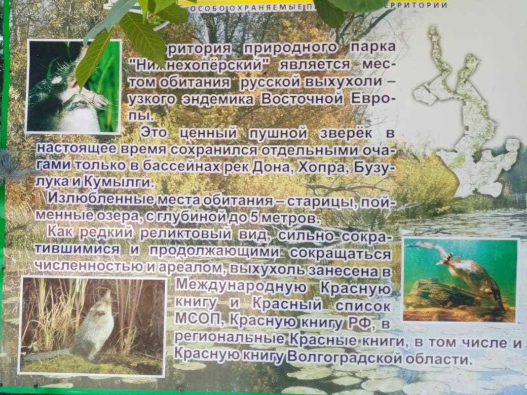 Помимо растений, занесённых в Красную книгу Волгоградской области, здесь водится уникальное животное — русская выхухоль. Это самая главная здешняя достопримечательность. В специальной литературе этого зверя называют глобальным реликтовым видом млекопитающего. Выхухоль занесена в различные Красные книги, в том числе и в Международную.