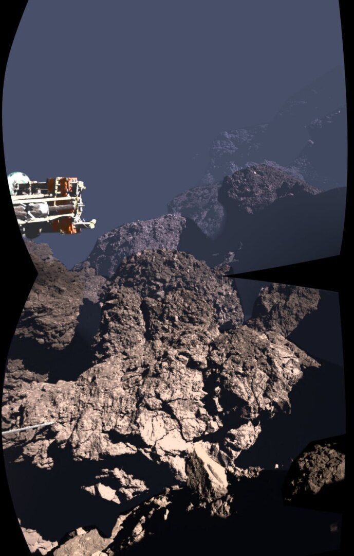 Снимок сделал аппарат "Филы", когда садился на комету Чурюмова-Герасименко. К слову, доставил его до кометы аппарат "Розетта".