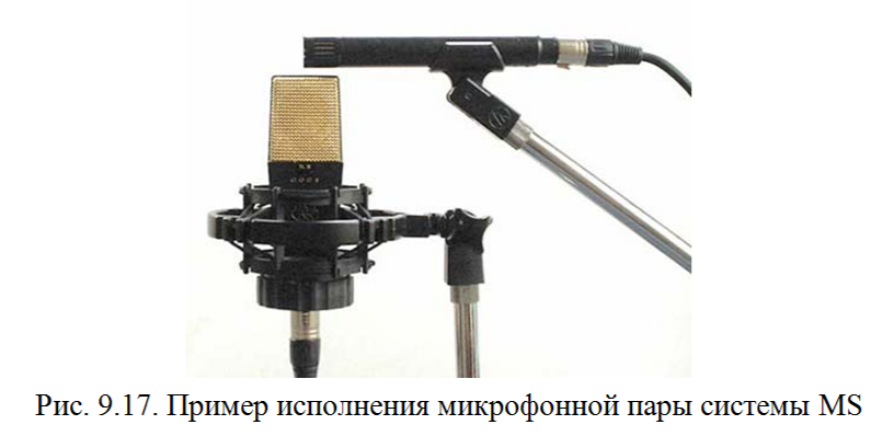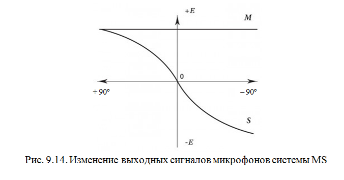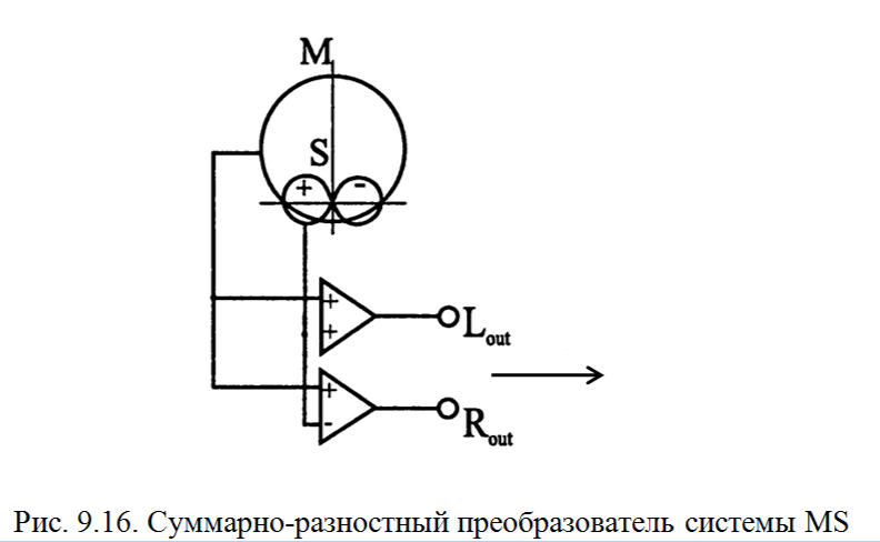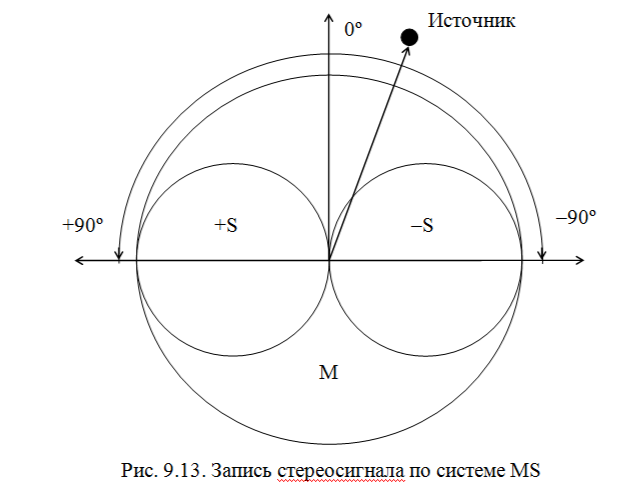 На практике разделение сигналов на «сигнал середины» и «сиг-нал направления» можно получить, если использовать два определенным образом ориентированных микрофона: один микрофон (M) должен быть приемником давления с кардиоидной или круговой диаграммой направленности, а другой (S) - приемником градиента давления сдиаграммой направленности типа «восьмерка». При этом микрофон «М», если он является кардиоидным, следует расположить таким образом, чтобы ось его максимальной чувствительности была направлена точно в центр записываемого музыкального коллектива (или иного объекта записи), а микрофон «S» - перпендикулярно этому направлению. Микрофон «М» также может иметь круговую диаграмму направленности(рис. 9.13).