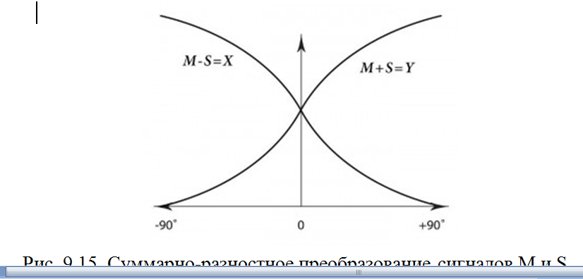 Однако сигналы M и S не являются конечными стереофоническими сигналами. Они содержат только промежуточную информацию в виде монофонической суммы и стереофонической разности. Чтобы получить окончательные стереофонические сигналы, пригодные для записи или прослушивания, информацию системы MS необходимо преобразовать в информацию XY. Для этого нужно произвести суммарно-разностное преобразование получаемых сигналов. Если в один канал направить сумму сигналов М и S, а в другой канал их разность, то зависимость выходного напряжения от направления прихода звуковых волн для каждого из каналов будет представлена соответствующими кривыми М+S и М–S (рис.9.15).