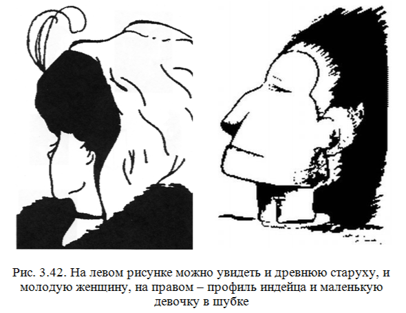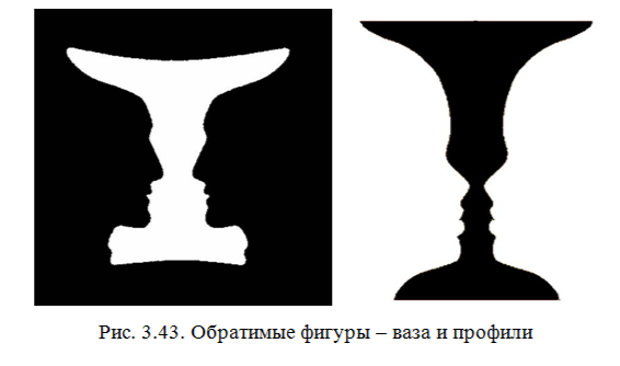 Простейшее формирование восприятия заключается в разделении зрительных ощущений наблюдателя на фигуру, т.е. рассматриваемый им объект, и фон, на котором эта фигура расположена. Выделение фигуры из фона и удержание объекта восприятия обеспечивается за счет работы психофизиологических механизмов. Клетки головного мозга, получающие визуальную информацию, при взгляде на фигуру реагируют более активно, чем при взгляде на фон. Фигура – это объект более яркий и содержательный, поэтому он кажется «выступающим» вперед. Фон кажется лежащим дальше от нас – за фигурой. Человек, прежде всего, обращает внимание и рассматривает именно фигуру, а не фон. Однако существуют рисунки, которые не позволяют сознанию однозначно определить, что именно является фоном, а что фигурой. При рассматривании подобных рисунков, фигура и фон на них могут меняться местами (рис. 3.42). Такие неоднозначные фигуры называются обратимыми.