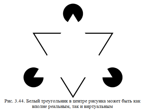 Объект, воспринимаемый как фигура, в нашем сознании ограничен замыкающимися линиями, даже если объективно они отсутствуют. На рис. 3.44 в качестве фигуры воспринимается белый треугольник и глаз очень точно способен определить его границы. Хотя никакого треугольника там может и не быть. С таким же основанием на рисунке могут быть изображены три черных окружности с удаленными (или закрашенными белым) секторами и три угла. Но, определенным образом расположенные, они могут создавать иллюзию присутствия в центре белого треугольника. Фигура всегда как бы выдвинута из фона и ярче. Фон в свою очередь простирается за фигурой.